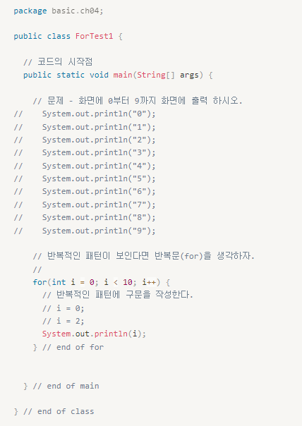 // 1 ~ 9 까지 아홉 번 반복하는 for 구문이다.