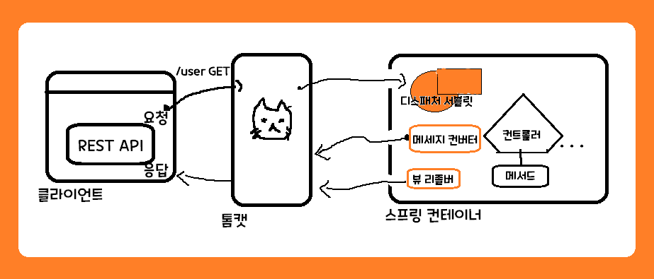 - 이때, 스프링 부트의 디스패처 서블릿(DispatcherServlet)이 요청을 받는다. 디스패처 서블릿은 요청된 URL을 분석하고, 이를 처리할 수 있는 컨트롤러와 해당 메서드를 찾는다.