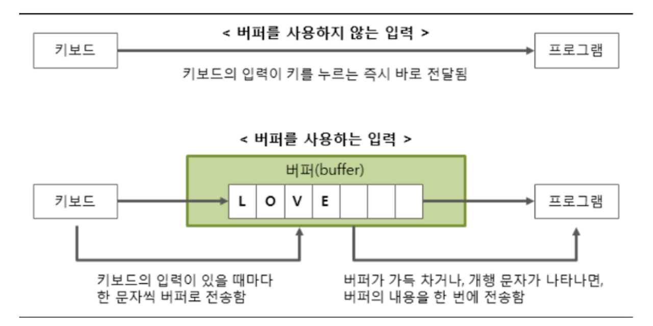 버퍼링은 데이터를 임시 저장공간인 buffer에 모아둔 후, 일정량이 모이면 출력 장치로 한 번에 전송하는 기술로, 반복적인 I/O 작업에 따른 성능 저하를 줄여준다.
