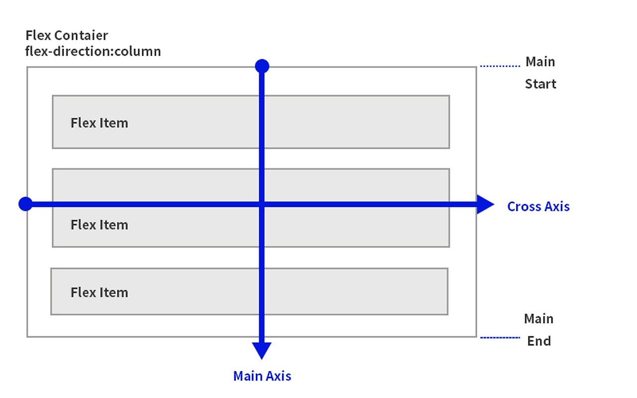 주축 방향(main axis) : Flex container에 선언된 flex-direction의 값에 따라 자식 요소인 flex item이 나열되는 방향이다. flex-direction : row 인 경우는 주축이 수평이 되고, flex-direction : column 인 경우는 주축이 수직 방향이 된다.