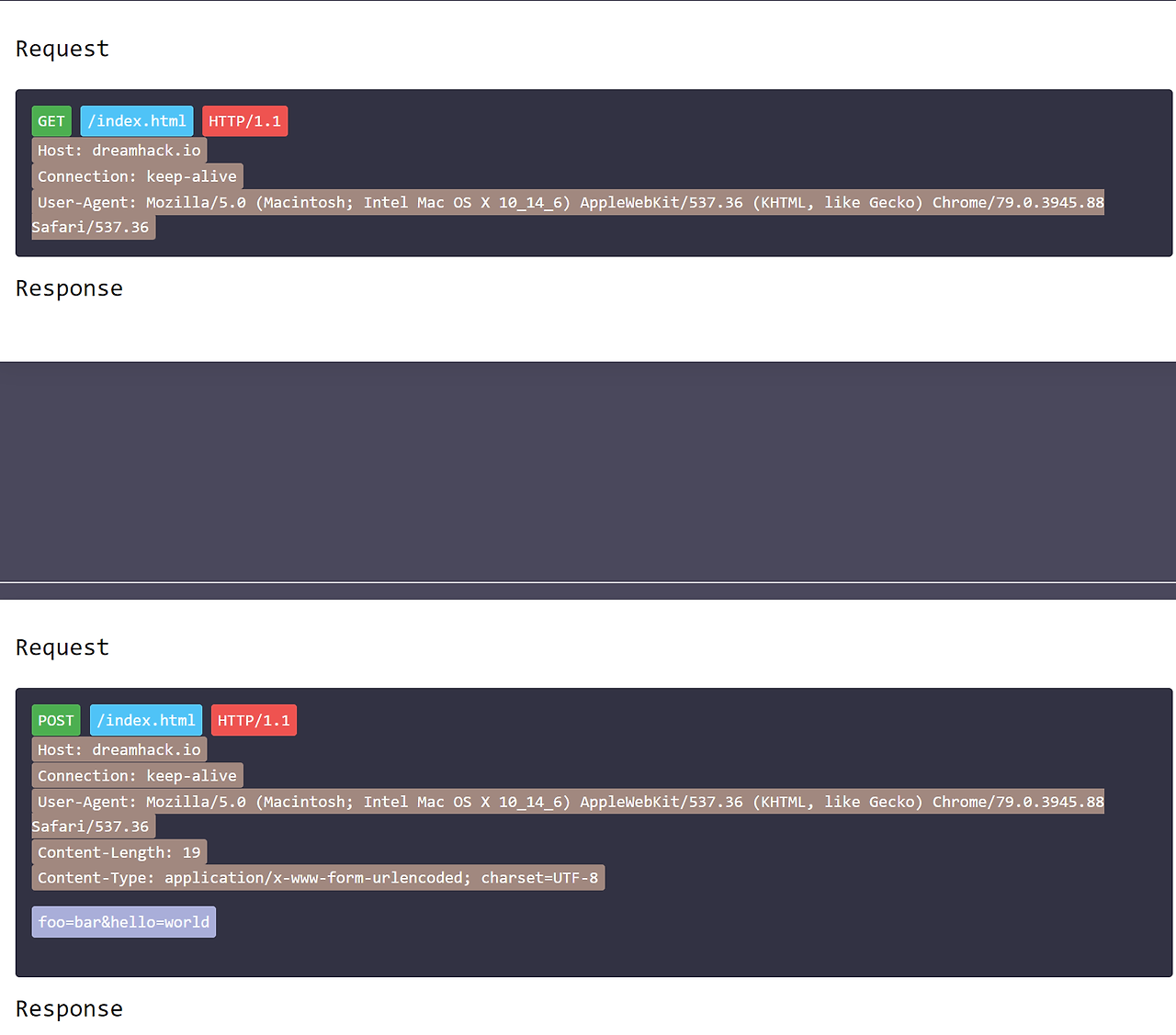 POST는 리소스로 데이터를 보낸다는 메소드이다. 전송할 데이터는 보통 HTTP 바디에 포함된다. 로그인할 때 입력하는 ID와 비밀번호, 게시판에 작성하는 글 등이 POST로 서버에 보내진다. 이 외에 요청 URI는 메소드의 대상을, HTTP 버전은 클라이언트가 사용하는 HTTP 프로토콜의 버전을 나타낸다.